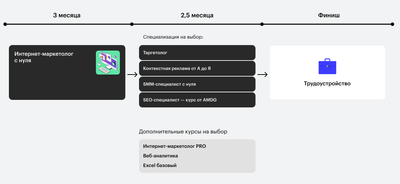 Вы сможете выбрать одну из четырёх областей интернет-маркетинга для более глубокого изучения: таргетинг, SMM, контекстную рекламу и SEO. Поработаете с реальными задачами и разнообразите портфолио.